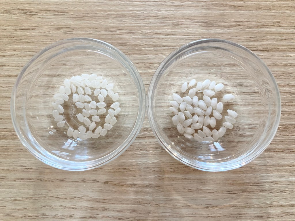 When you buy non-Japanese rice, make sure you buy short or medium grain, and avoid long grain options like basmati or jasmine. I like basmati and jasmine too, but their dryness and distinct flavors don’t pair well with Japanese dishes. The picture shows Japanese rice (left) and Spanish rice (right). The Japanese grain is smaller, shorter, rounder and more transparent. But, trust me, they don’t look that different once cooked!