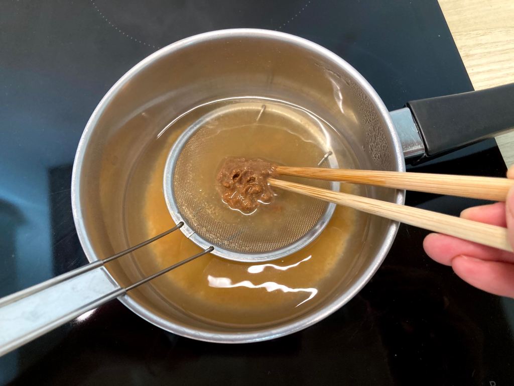 2. Add miso. Reduce the heat to low, and put miso3 in the dashi and mix it well. You may find it easier to use a strainer or spoon to melt it first (or you may get a chunk of miso stuck in the bottom). Do not boil the soup again once the miso is in, as it will destroy miso’s flavor and nutrients.