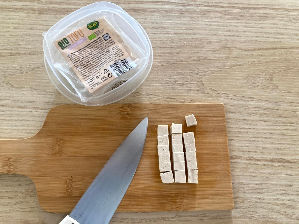 3. Cut tofu. Cut as much tofu4 as you like in small cubes (1-2cm or 1/2-1 inch). Tofu breaks easily and does not need to be cooked, so we add it at the end, after the miso. *But if you are cooking harder ingredients like vegetables, they should be added in the soup and cooked before the miso goes in.