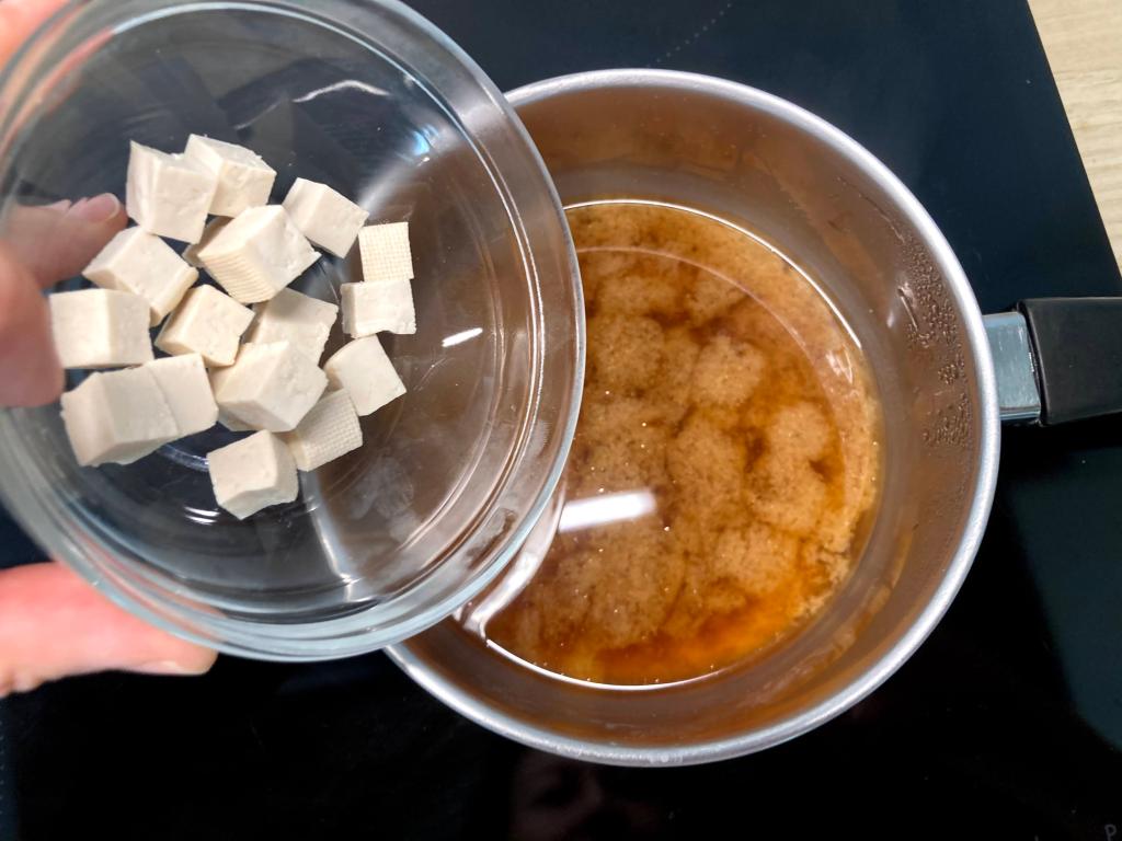 4. Add tofu. Add the tofu and your miso soup is done! Here, I am putting only about 20g, but add in as much as you want. Sprinkle negi5 or green onion when serving, and enjoy!