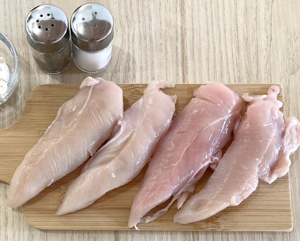 1. Prep the chicken. Salt & pepper1 the chicken2, on both sides. Then coat it with flour3.