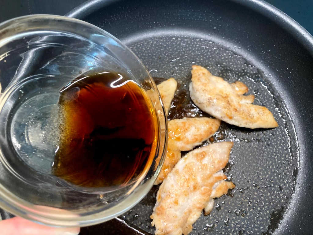 7. Pour the sauce and keep cocking. Pour the teriyaki sauce mix over the chicken. Cook for another 3-5 minutes on medium heat while flipping the chicken a couple of times to marinate both sides in the sauce.