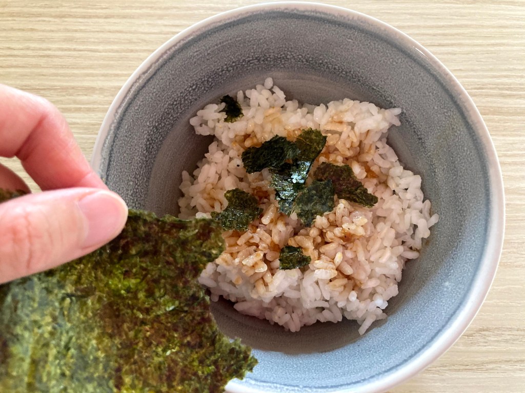 2. Sprinkle seaweed over the rice. Crumble the seaweed3 and sprinkle over the rice.