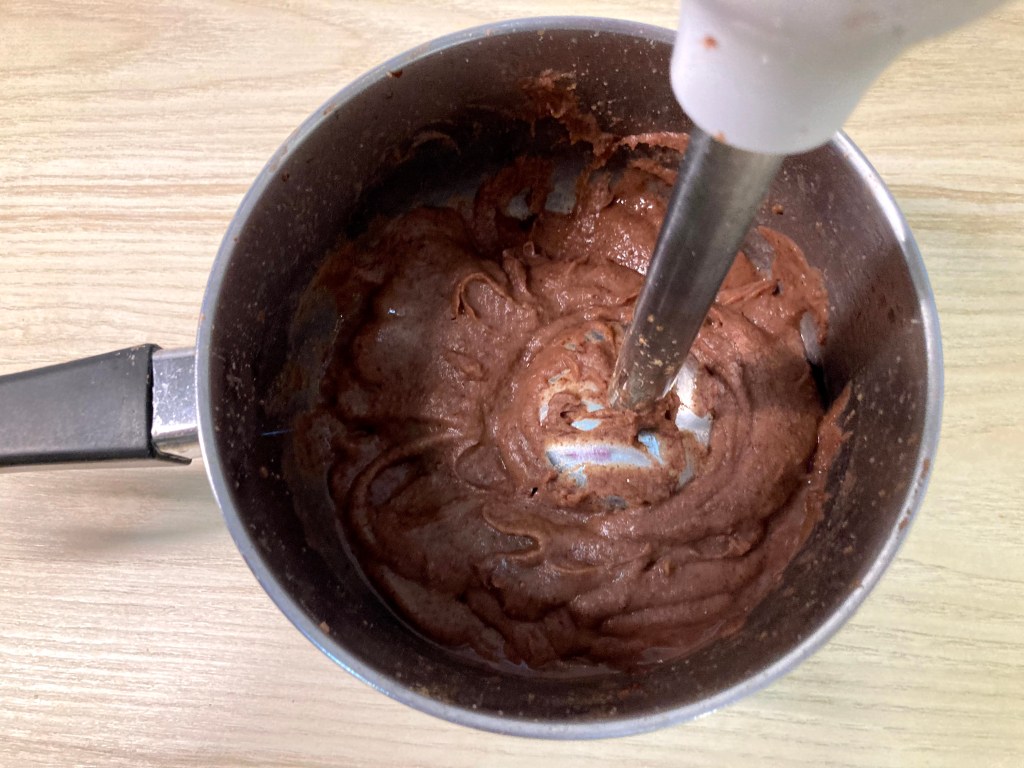 7. Puree the azuki. Turn the heat off when the azuki became soft. Keep the water in the pot with the azuki, and puree them with a hand blender until there is no tissue left. Add water if necessary, just enough to be able to puree.