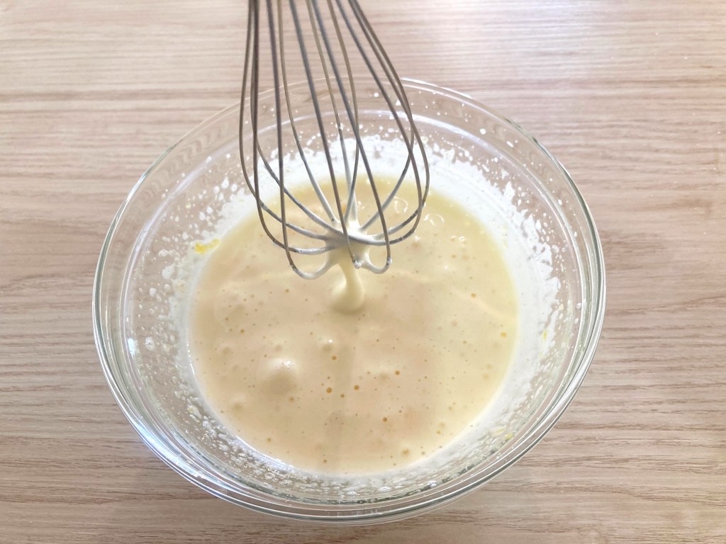 2. Whisk the egg mixture. Whisk the egg mixture until it turns custard color, you achieve a texture more or less similar to the Caesar salad dressing.