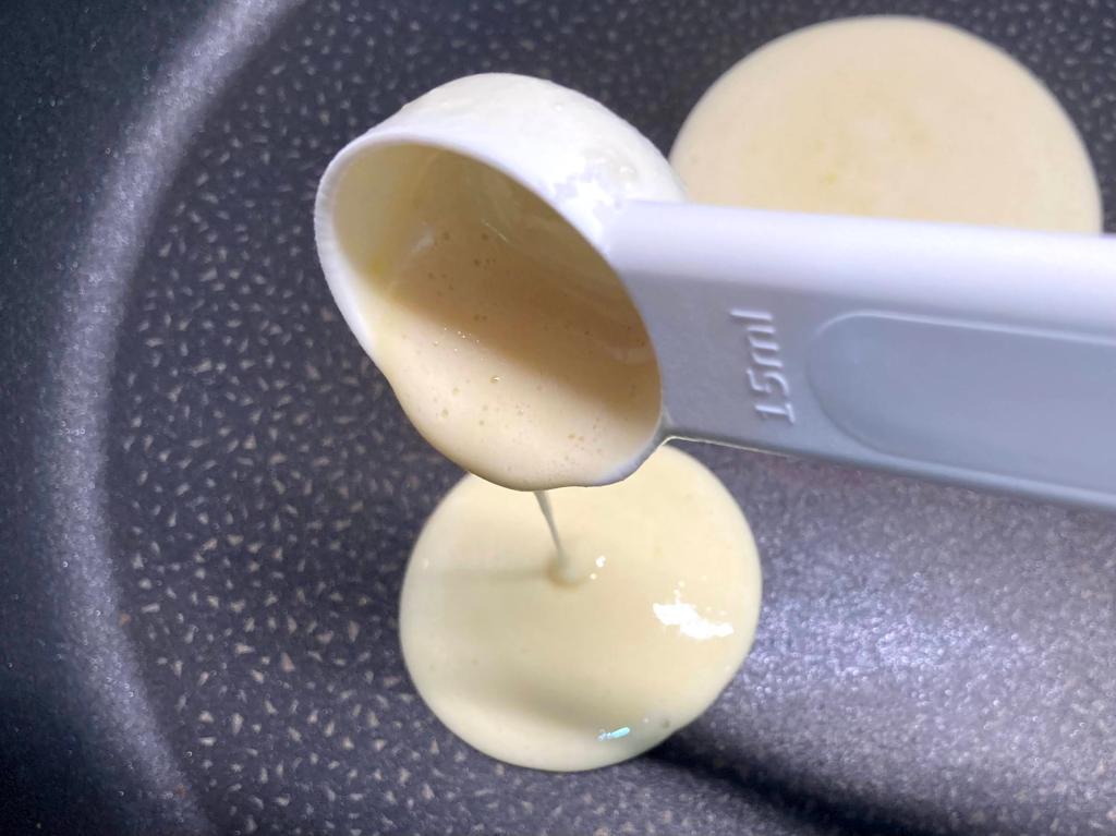 5. Make pancakes. Pour the batter onto the heated non-stick (or very lightly oiled) pan and cook on low-medium heat. One tablespoon (15ml) yields a dorayaki of approximately 7cm (3″) in diameter. When pouring the batter, stay firmly on the same position (which should be the center of the pancake) to achieve a perfectly round shape.