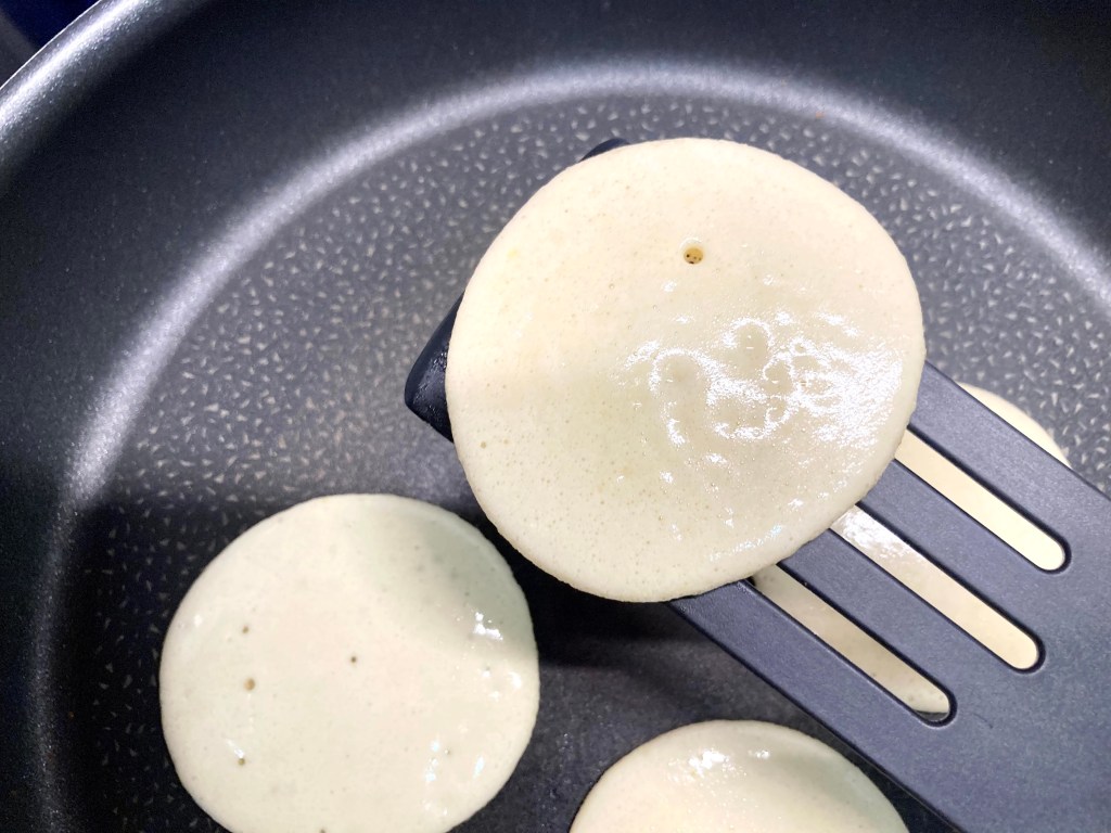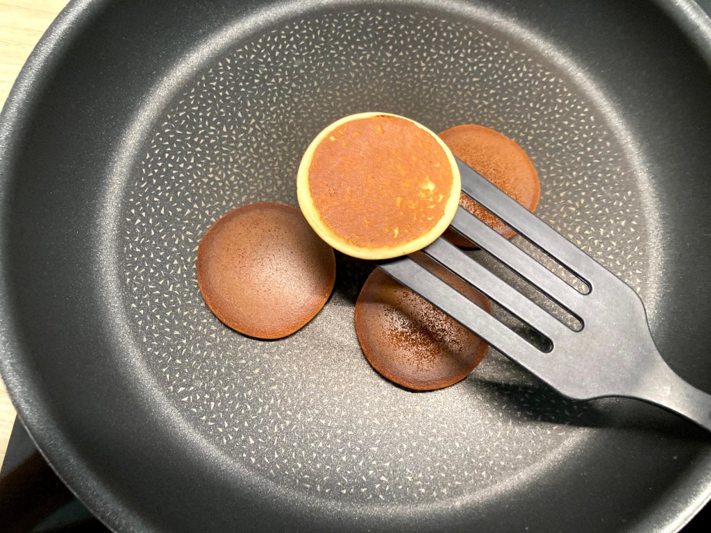 6. Flip. Flip the pancakes when the surface starts to bubble and the edge starts getting dry and round (usually 2-3 minutes on my cooktop). The bottom should be dark-brown dorayaki color (darker than regular pancakes). Honey and baking soda make them darken more quickly than regular pancakes, so check carefully not to burn them.